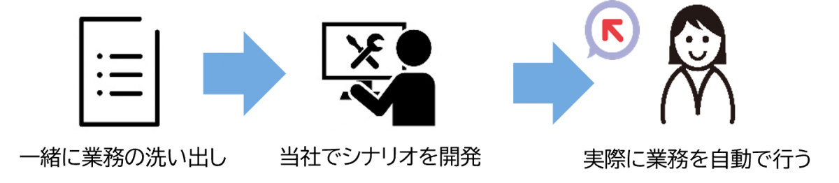 開発にかける時間がない、シナリオの開発が難しい時に お客様の業務をしっかりとヒアリングを行い、 ご希望に沿ったシナリオを開発します。 ※有償